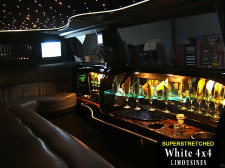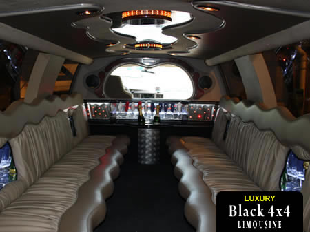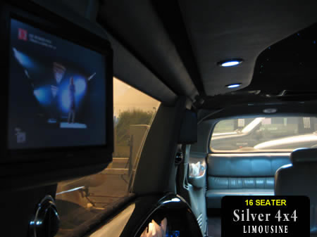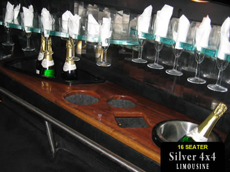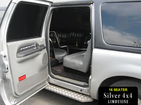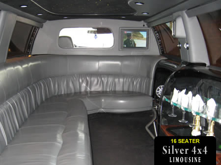 Our Silver 'Hummer limo' style 4x4 is licensed for upto 16 passengers per journey and includes comfortable leather seating, colour-changing light systems, tinted windows, ice buckets and backlight VIP bar area! Share a prom ride with your friends or other prom dates, enjoy an easy ride to the airport or treat a loved one to a limo ride!