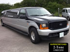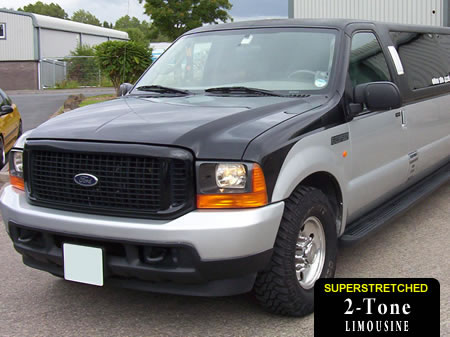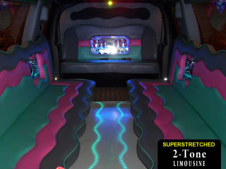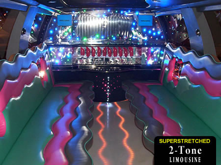 The 16 passenger Two Tone limousine includes a fantastic custom built interior thats designed to make your journey or special occasion extra special! Step aboard, sit back and relax as we chauffeur you in comfort to your destination. The one of a kind passenger area includes an amazing discofloor with underlights, multi-colour changing lighting and laser system, 4 TV units with a DVD player, an audio system with 4 sub woofers, cool three tone leather seats, privacy divider and tinted window!